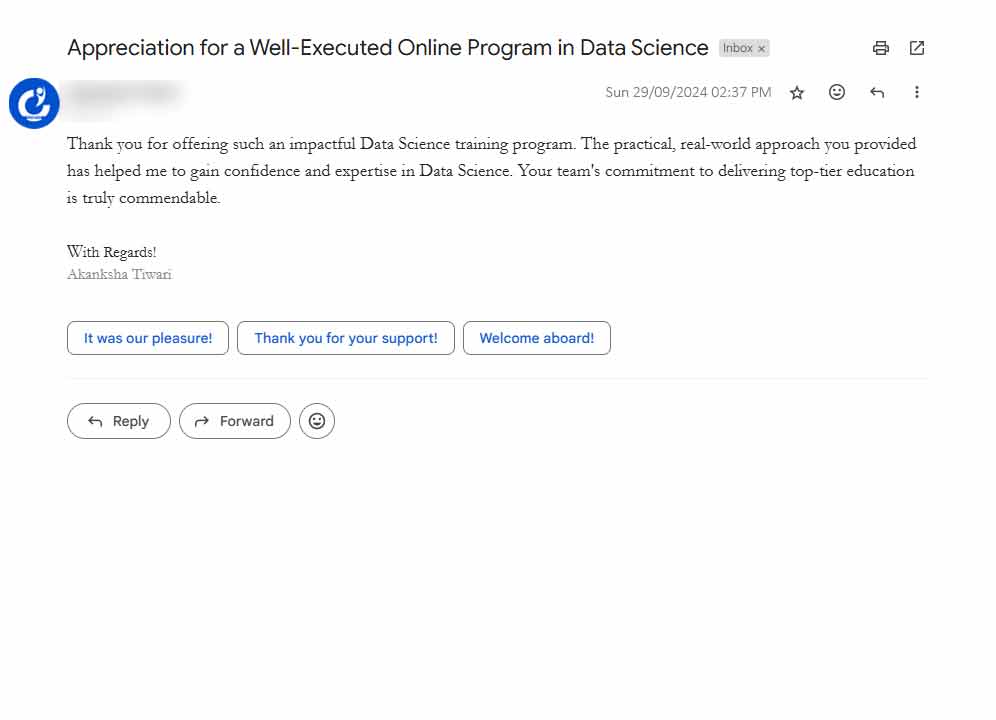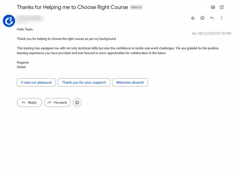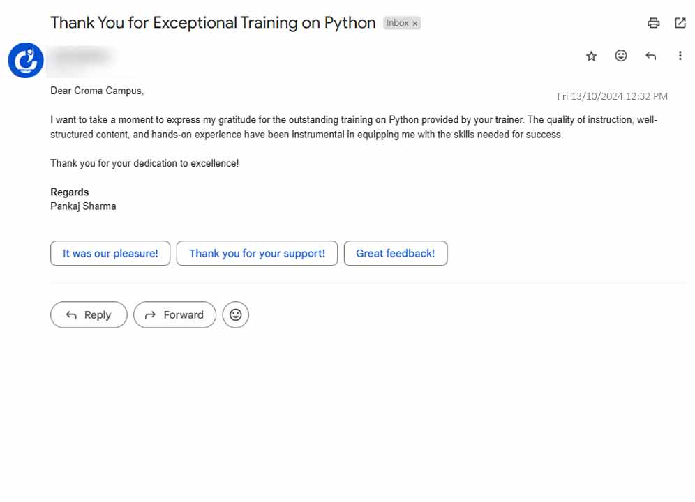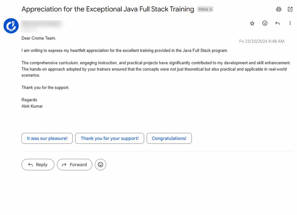 Our Croma Campus Student Email Reviews are legit proof that student has thoroughly liked their sessions. It has received outstanding positive reviews from its students regarding the excellent support and guidance provided by our faculty members. Here, students appreciate the timely responses and personalized assistance they receive, fostering a positive and engaging learning experience.